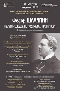 31 марта 2026 года в рамках просветительского проекта «Общедоступные музыкальные собрания в Картинной галерее Ильи Глазунова» состоится театрально-концертное представление "Федор Шаляпин. Память сердца, не подправленная никем" в исполнении солистов Московского академического Музыкального театра им. К.С. Станиславского и Вл. И. Немировича-Данченко: Мария Пахарь (сопрано) и Михаил Головушкин (бас). Партию фортепиано исполнит Дипломант Международных конкурсов Анна Рахман. С художественным словом перед гостями выступит Александр Леонтьев.